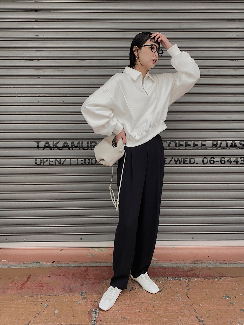 ハーフジップのスウェットとスラックスPTでスポーツミックスコーデ。 袖の切替デザインや袖のボリューム感が 可愛いトップスです♪ 見て頂きありがとうございます☺︎ Instagram 👉mariko____wear