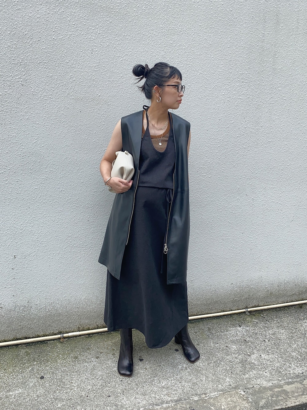 MARIKOのベスト「レザーライクロングジレ」を使ったコーディネート