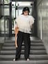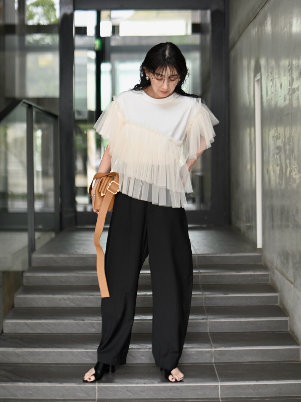主役級のTシャツ ボトムスがシンプルでもこれ一枚で決まる! 袖と斜めにドッキングされたチュールが可愛いTシャツ♪ Instagram ☞mariko____wear
