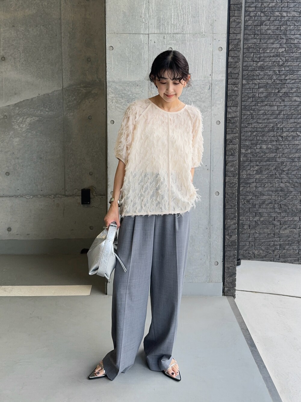 スタイリングの主役! フリンジデザインと、透けすぎないシアー感が、合わさったトっプスが可愛いんです。 ボトムはシンプルで十分 見て頂きありがとうございます😊 Instagram ☞mariko____wear