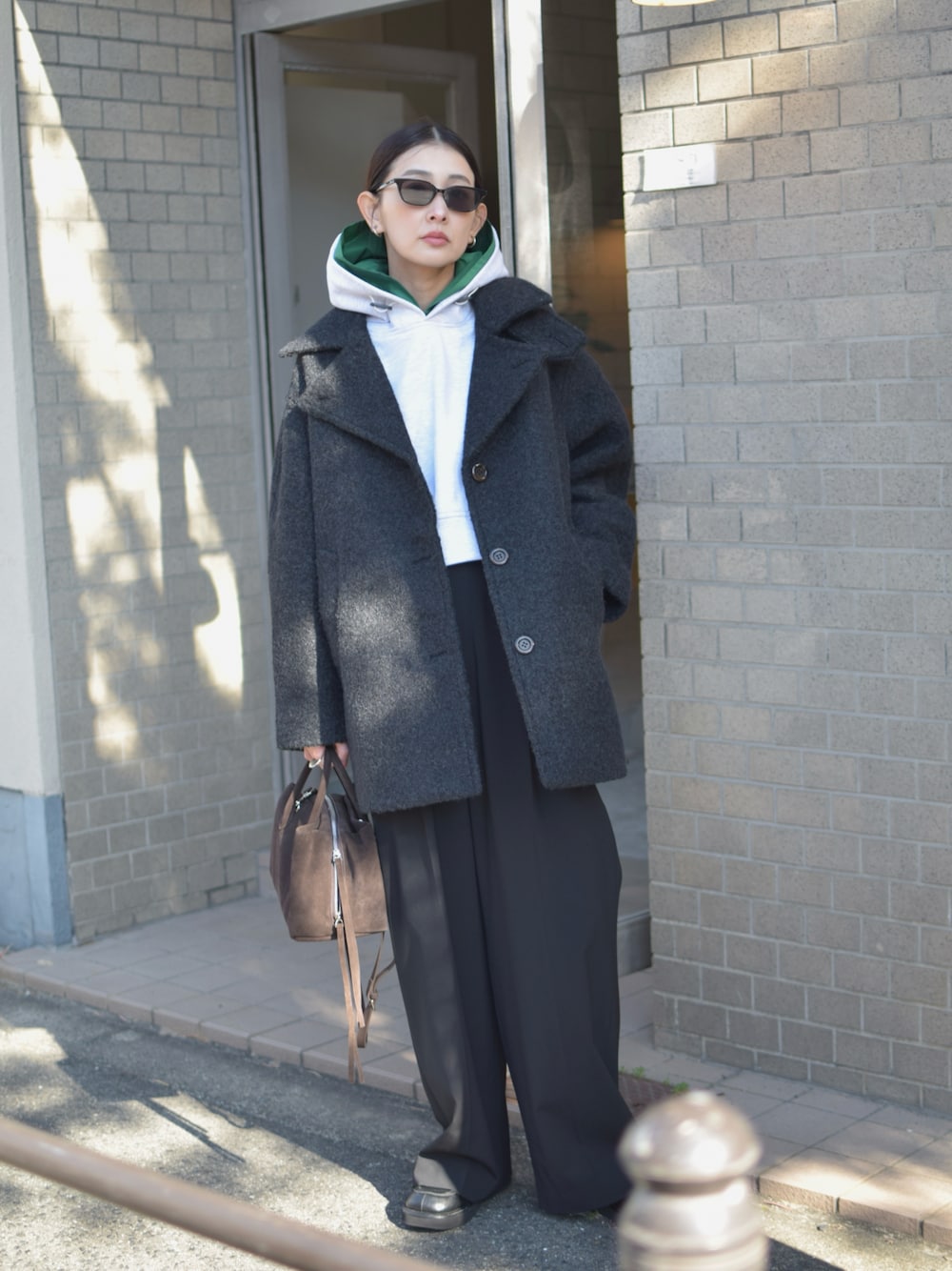 パーカーのフードに、グリーンのフードがドッキングされたEKATのパーカー。 コーデのアクセントになるし、丈もコンパクト目だから脚長効果抜群です!! ブークレコートは軽いし暖かいよ🧥 見て頂きありがとうございます😊 Instagram →mariko____wear