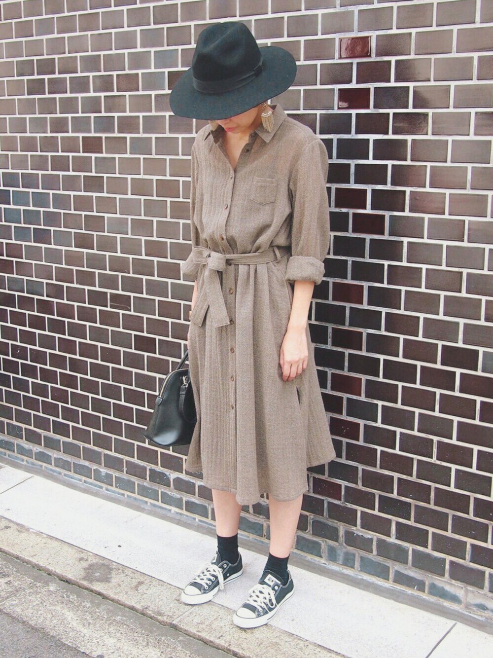 羽織りとしても着れるワンピースを今日はシンプルに1枚で着てみました◡̈⃝ ウール100%なので暖か〜い♬ ファーが付いているイヤリングで秋感をプラス★