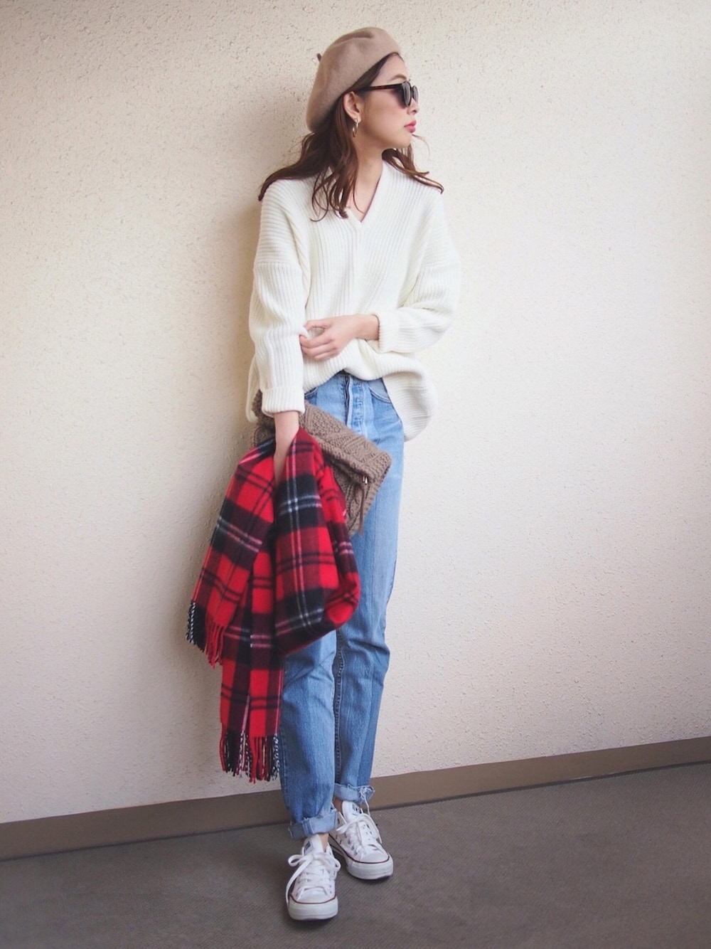 BAYFLOWのセールで購入したVネックのニット⭐︎ゆったり感、ボリューム感最高!!🎵 シンプルにリーバイスのリメイクデニムで合わせました😸