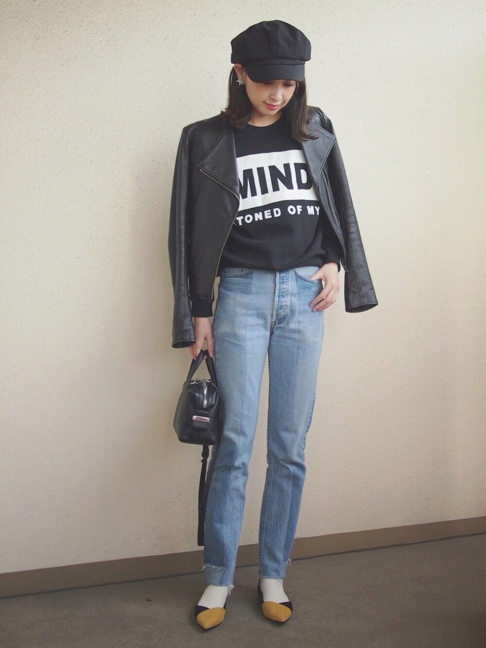昨日コーディネート♠️ ライダース+スウェット+デニムのコーディネート😸 足元はZARAで購入したペタンコパンプスに白ソックスに👠