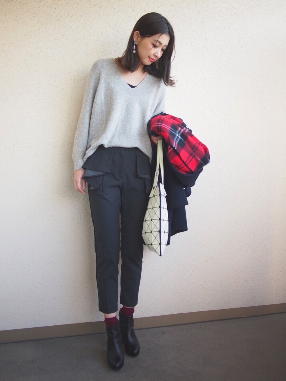 グレー×チャコールグレーのコーディネート♠️ 差し色に赤のマフラーと赤の靴下をいれました😸
