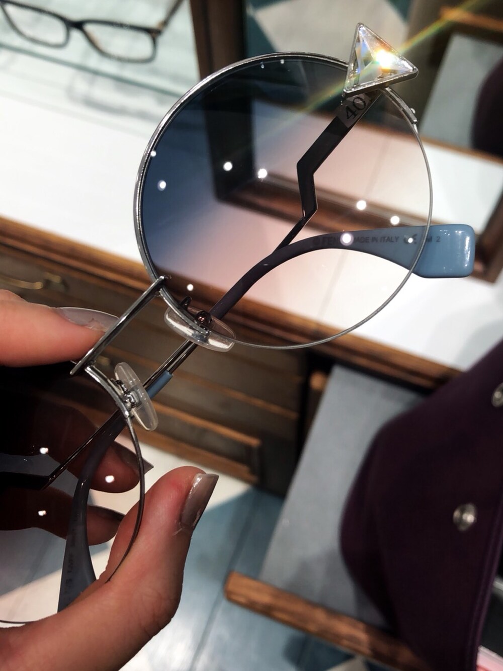 FENDIのサングラス。紫とピンクのグラデーションカラーのレンズと、▼のクリスタルと、かけるところのグレーブルーがたまんないでしょ?