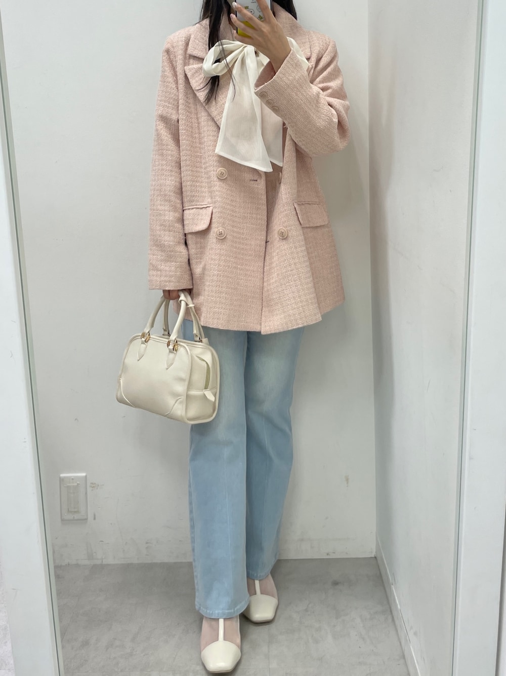 ピンクカラーが可愛いツイードジャケット♡ ウエストリボン外してゆるっと着ても可愛いんです! 162センチで腰下の長さで、ちょうどいい長さです◎