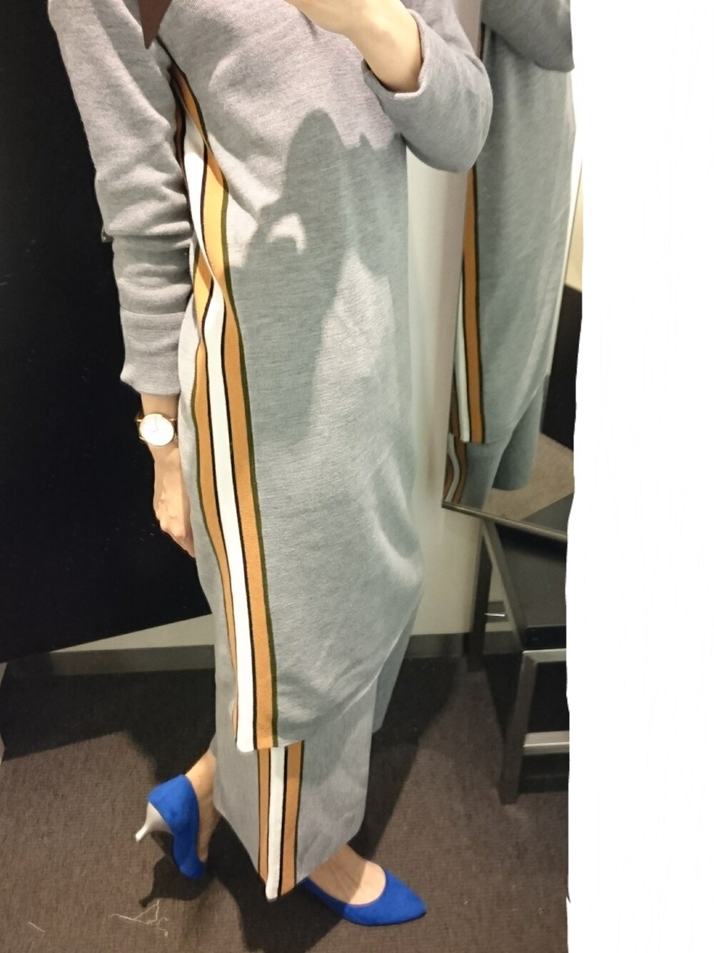 オレンジとカーキと白のラインが入ったニットロングワンピとパンツをセットで。 スラリになれるよ。