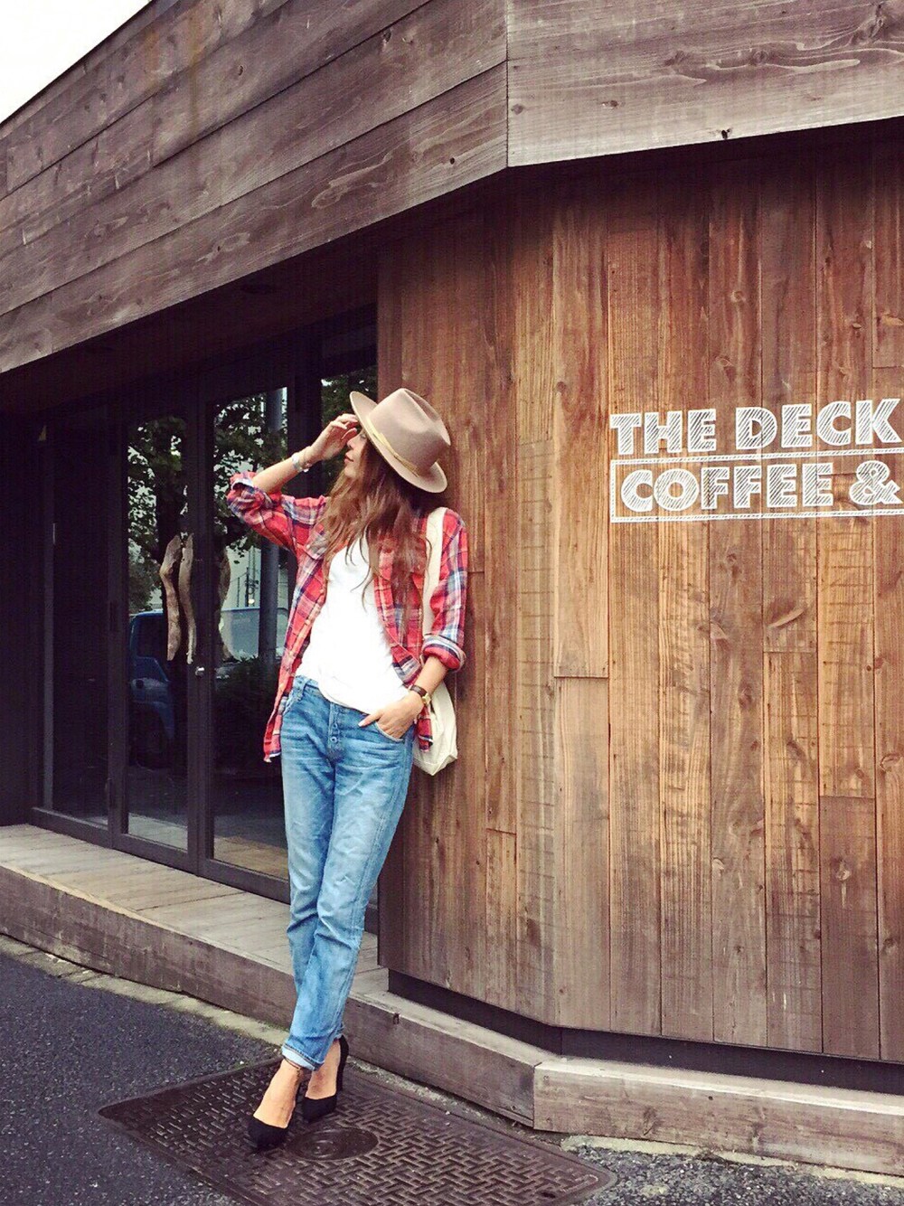 シャツはハワイのアウトレットでget☺︎ 白T × デニム の大好きなスタイルに ヴィンテージ感のあるレッドを合わせて☺︎ プチカウガールw