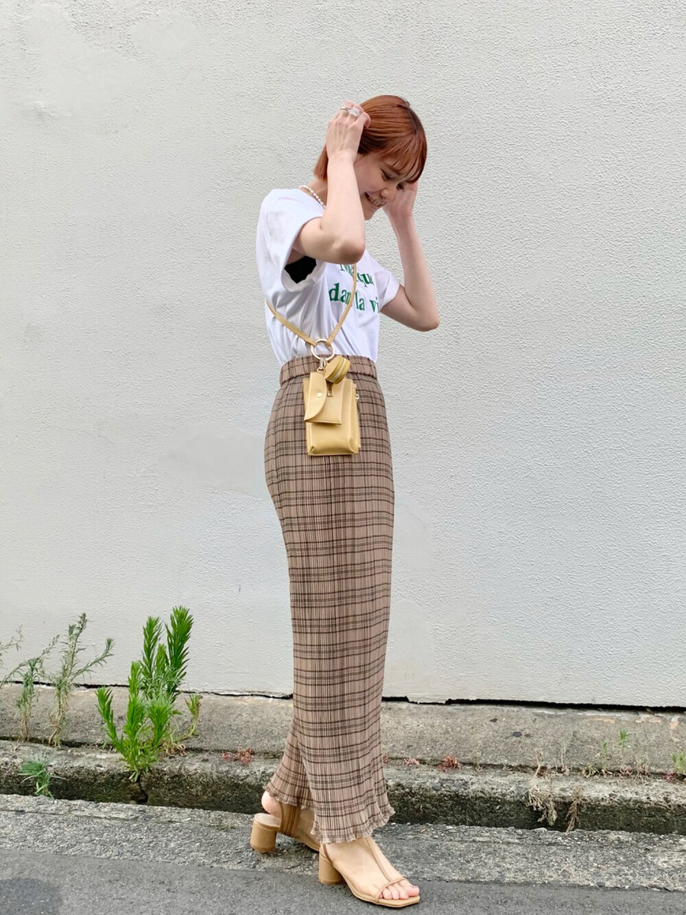 秋意識のチェックcode 🥖 グリーンのロゴTにチェックスカートが レトロな雰囲気に。 ig @mari_lemage