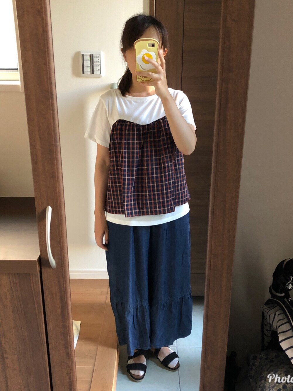 *2018/10/7*コーデ記録🗒 ・ビスチェ風ドッキングプルオーバー(studioCLIP・オフ×チェック) ・デニムティアードパンツ(ehka sopo ・ネイビー) ・カラーフェイクスエードクロスサンダル(SM2 ・ブラック)
