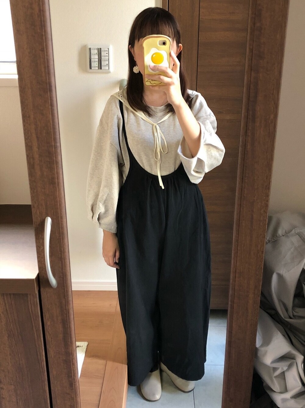 *2018/11/3*コーデ記録🗒 ・セーラー衿裏毛プルオーバー(SM2・ベージュ) ・ヘリンボンギャザーキャミサロペット(SM2・ブラック) ・花柄ギャザースカート(SM2・チャコールグレー) ・レザースリッポンシューズ(SM2・ベージュ) ・生成り色二枚重ねflowerピアス(りーちゃんメイド=fluffy…*さん