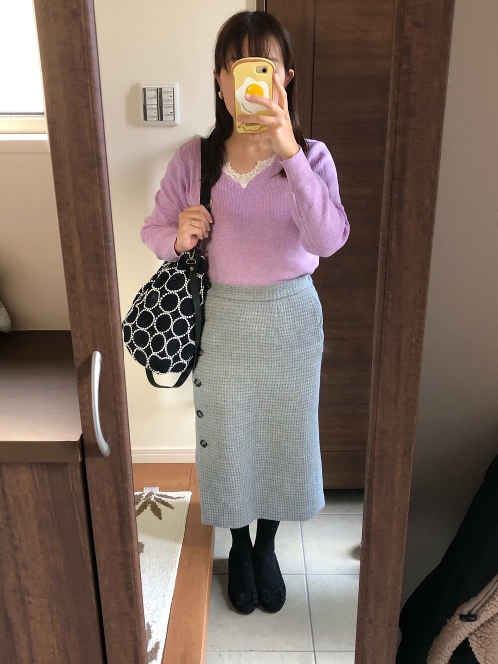 *2019/2/4*コーデ記録🗒 ・衿ぐりレース使いVネックプルオーバー(Te chichi・ラベンダー) ・釦ワッフルタイトスカート(Te chichi ・グレー ・パンプス(ORiental TRafficc・ブラック) ・雫バッグ(まるみさんメイド=R2さん・タンバリン/ネイビー×ホワイト)
