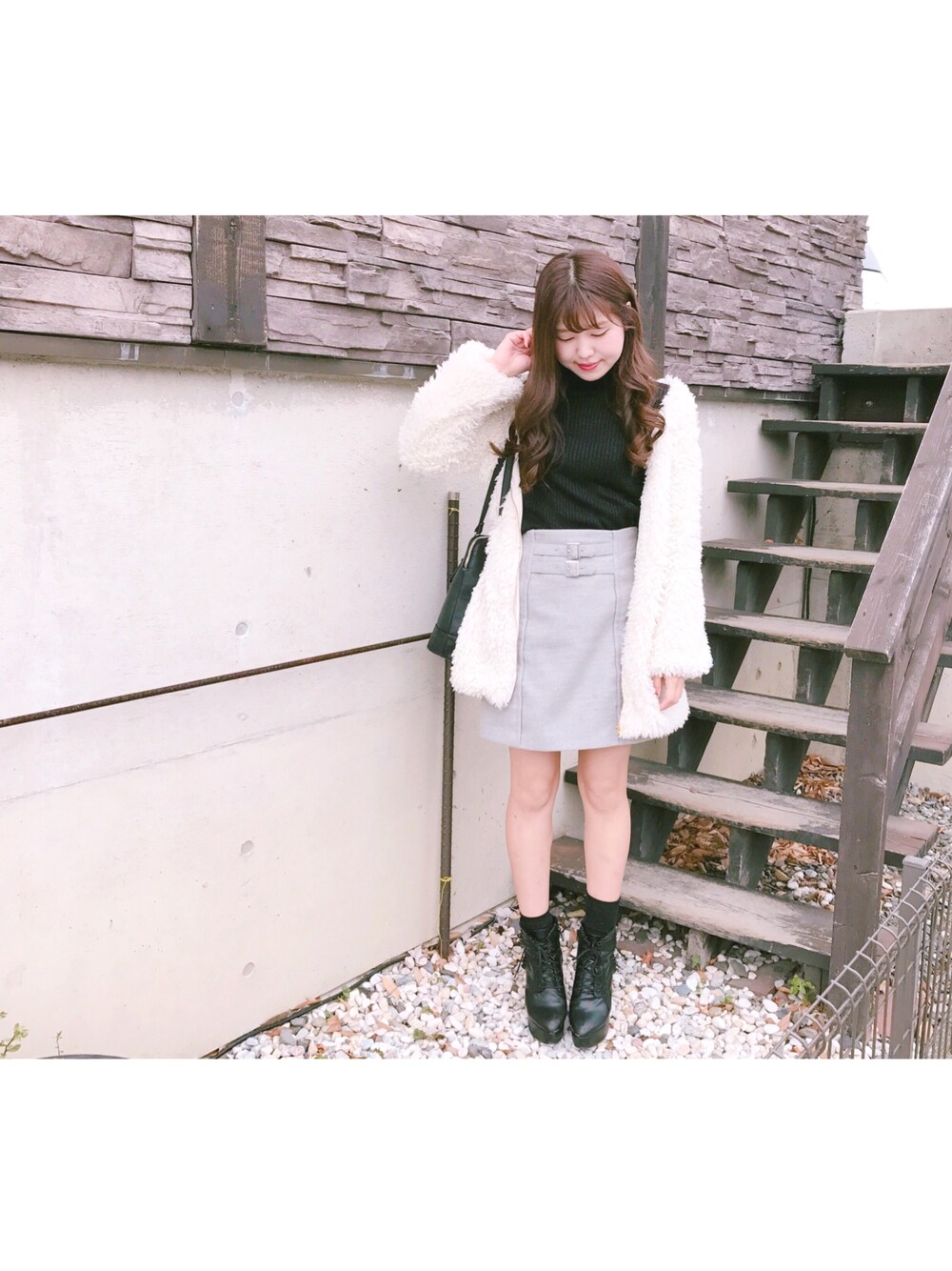 もこもこ🖤 新作のダブルベルトスカートに、 GUのラメリブトップス🥀 フリルショートブーツは、 長時間履いても疲れない お気に入りのブーツ👢💗🌷 大人なカラーを使ったコーデに、 ホワイトのプードルコートを合わせて ガーリーによせた😏 もこもこアウターは、着ぶくれしないようにショート丈のスカートと合わせるのがすきです!🖤