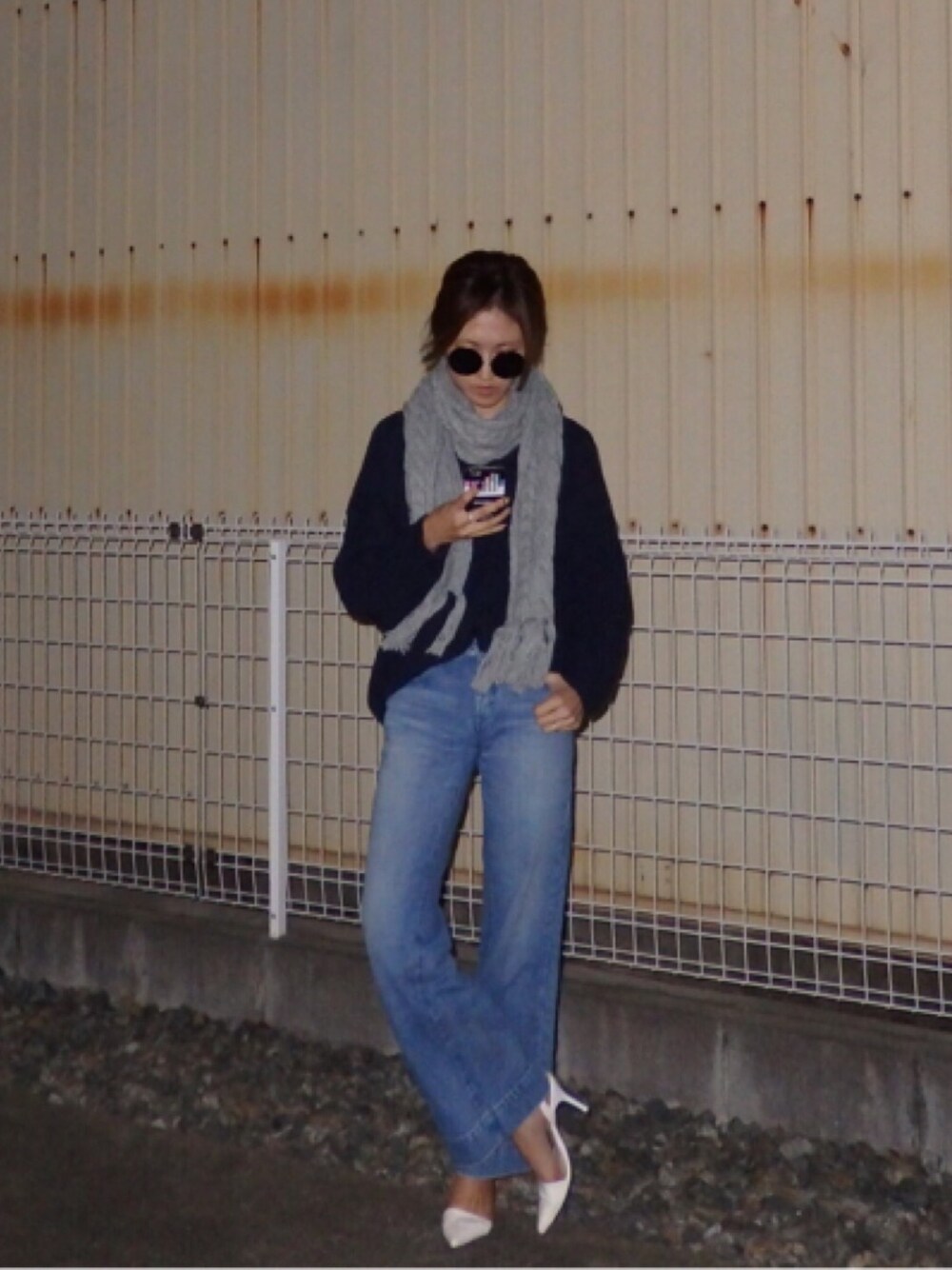 ぃっの日かのcoordinate☆ GUのニットマフラーがお気に入り♪(´ε` )今年はニットマフラー×フリンジが気になってたからこれがホンマどツボだったの(≧∇≦) それ以外のitemはブルー系で統一( ^ω^ )ネイビーニット×デニムワイドパンツ♡