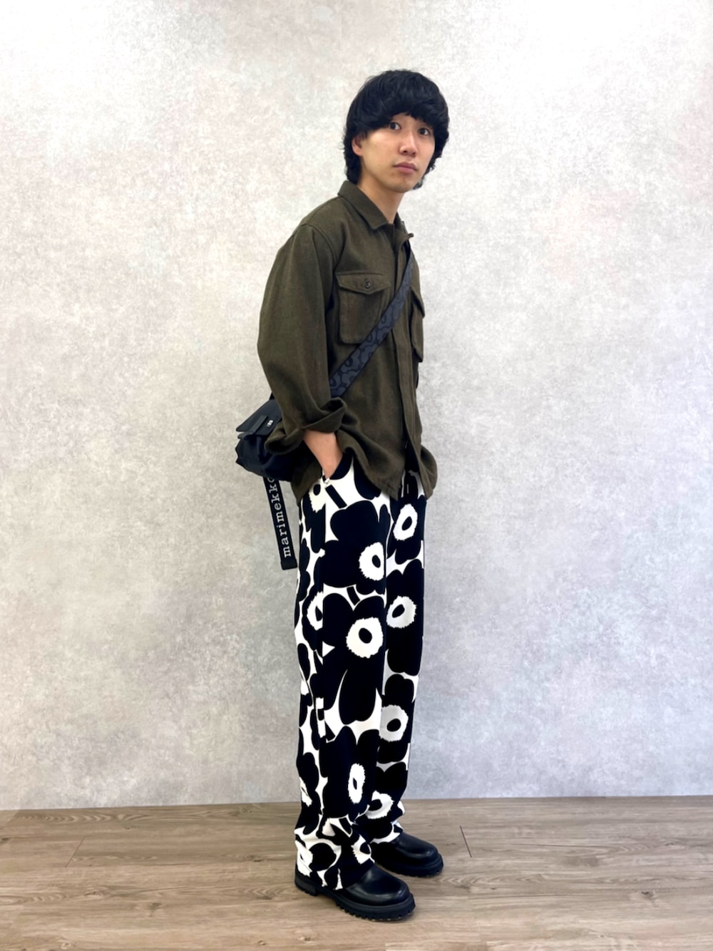 カジュアルなシャツスタイルのシンプルコーデ。モノトーンの中でかわいいウニッコがポイントの柄パンツとショルダーバッグで春のお出かけへ。 ※ボトムは、公式オンライン・一部店舗でのお取扱いになります。