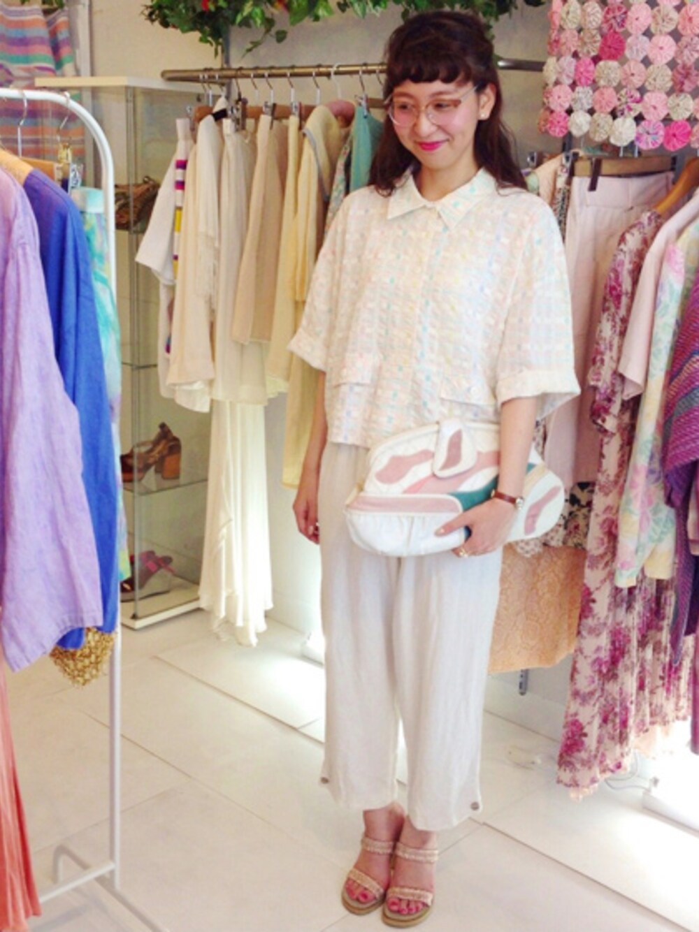 淡い色合いでデザインの効いたシャツと白のパンツを合わせた全身古着スタイル◎