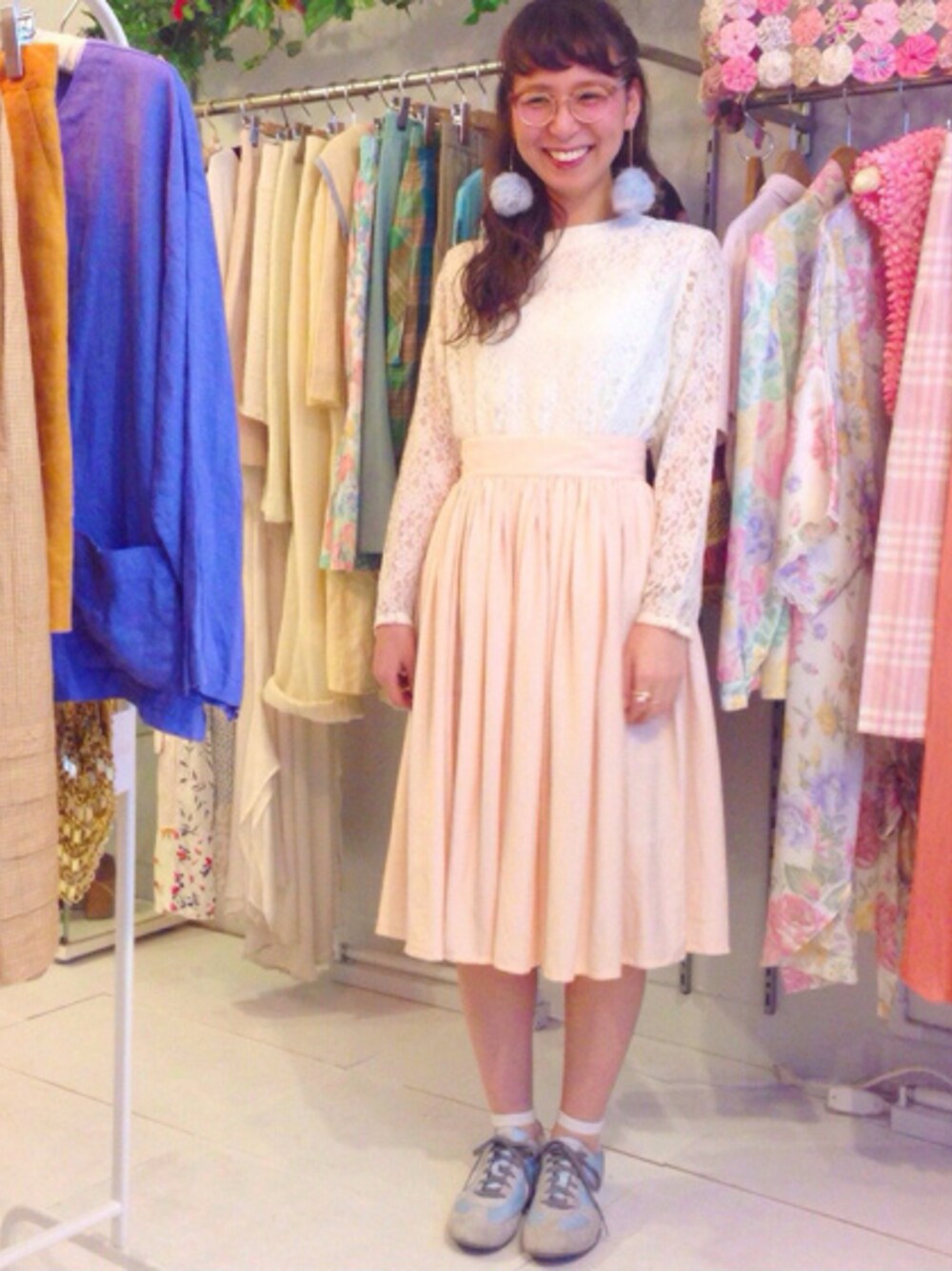 白のレーストップスにベビーピンクのスカートに水色のイアリング&スニーカーで淡色コーデ◎