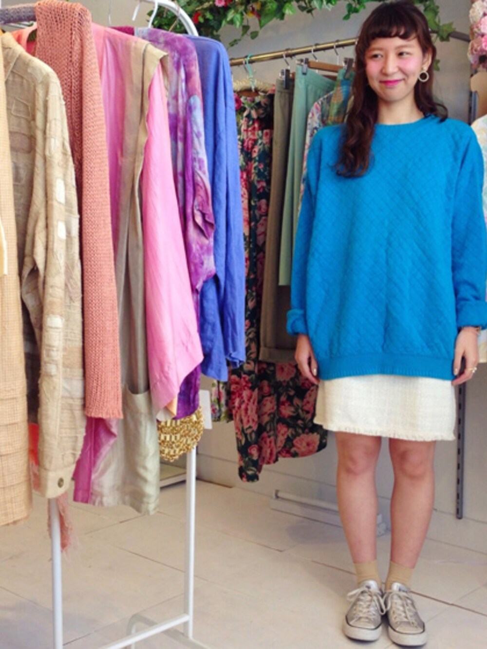 青のニットと白のスカートとシルバーの靴でシンプルだけど遊び心の効いた古着スタイル♡