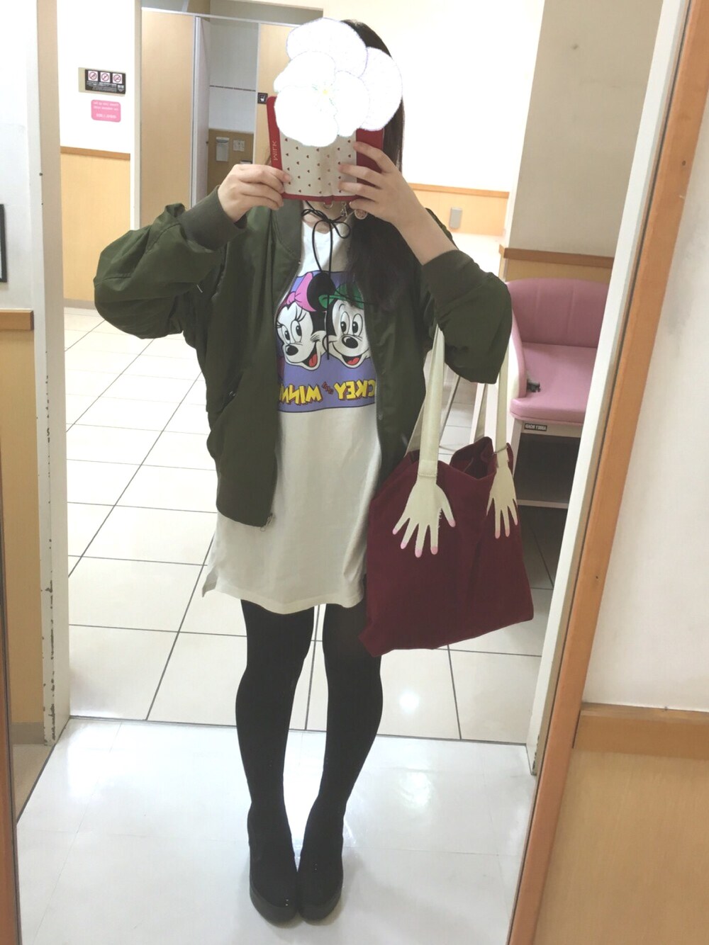 merry jennyのディズニーTシャツ、私の背丈だとワンピースにぴったり! jouetieのブルゾンと相性バッチリ❤️
