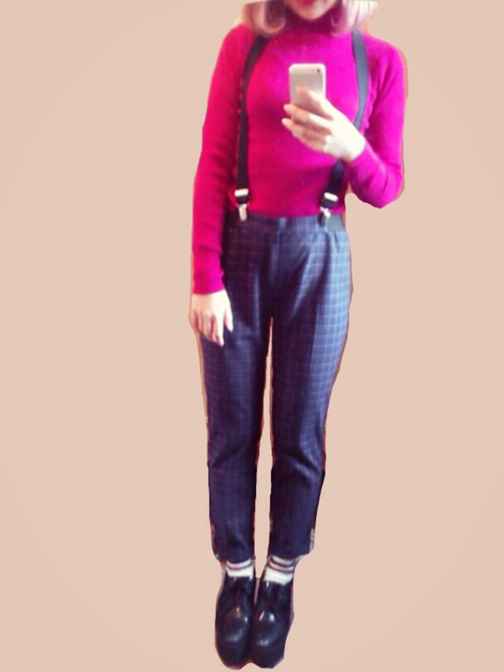 ピンク系のニット/セーターを着用したレディースの冬コーディネートの1枚目の写真