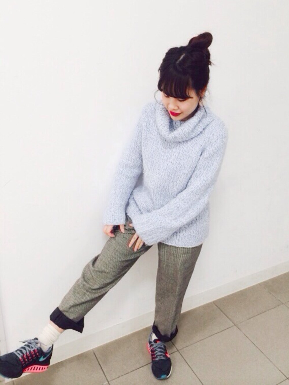 ブルー系のニット/セーター、グレー系のその他パンツを着用したレディースの冬コーディネートの1枚目の写真