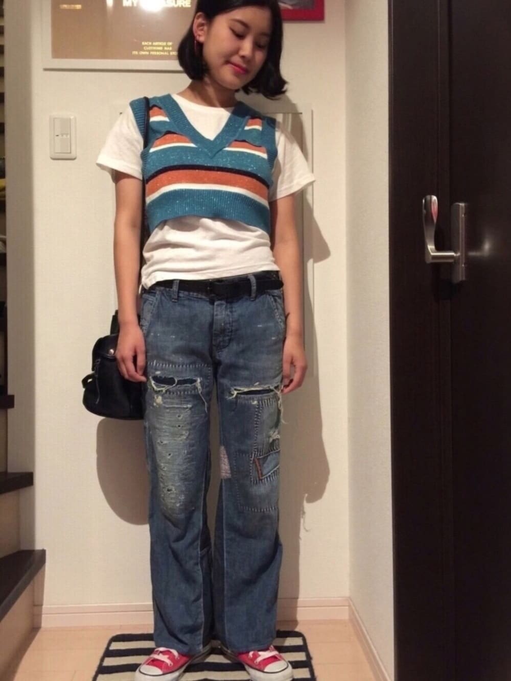 jouetieのハンサムニットベスト♡ ラメ&カラフルボーダーがツボです! ベストがコンパクトなので少しワイドなシルエットのデニムを合わせてみました。