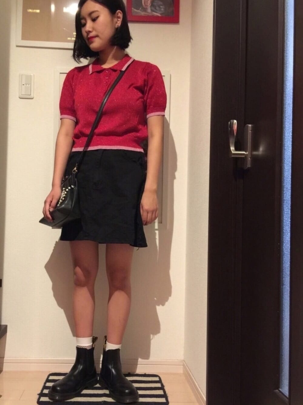 ラメニットポロシャツの他はブラックでまとめました。