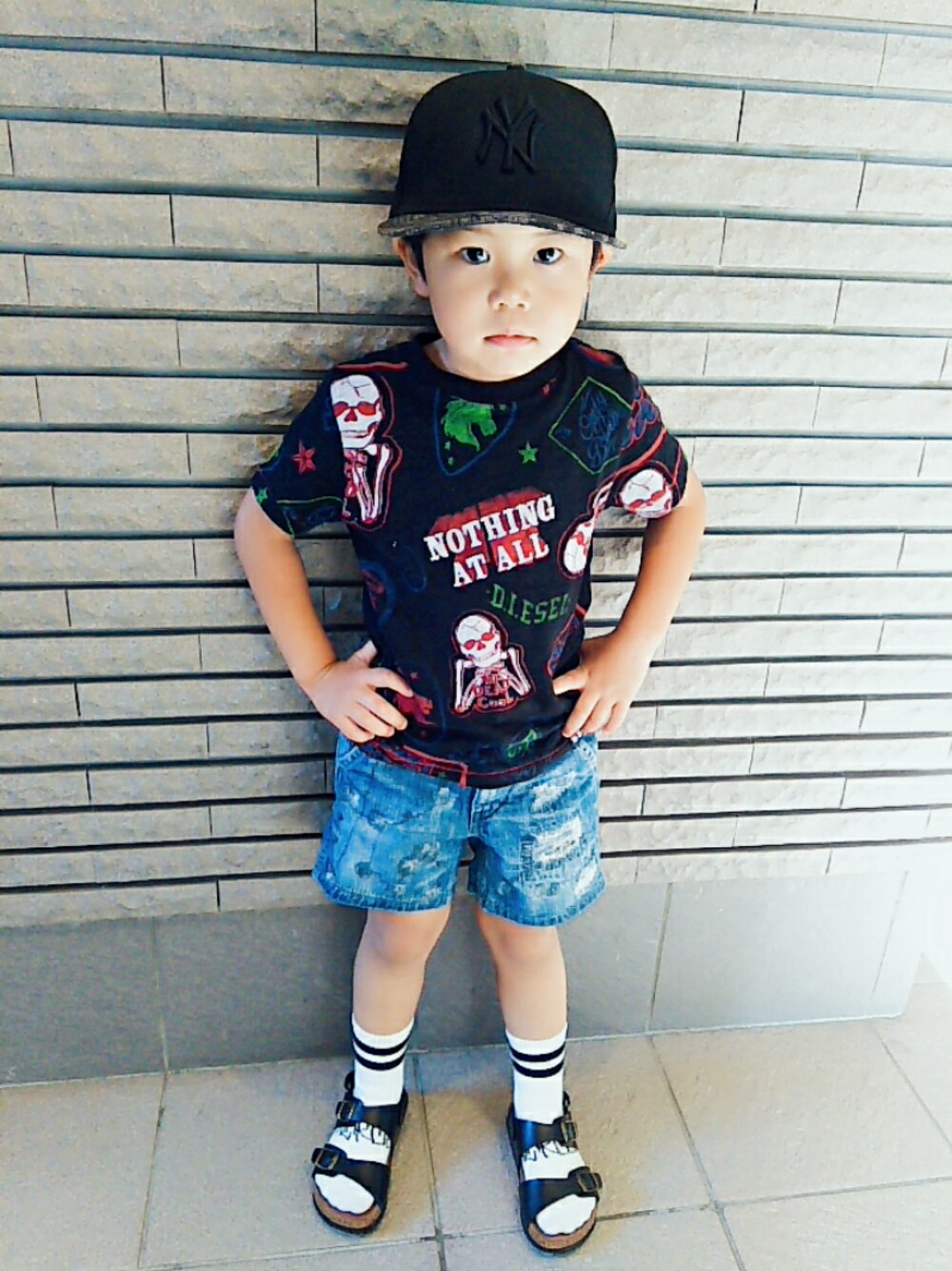 最近このポーズがお気に入りらしい。。。笑 Tシャツ👕にデニム👖、ラインソックス👟履いて、締めにはキャップ👲 王道のスポーティーカジュアルファッションです☺✨ Tシャツは生地が柔らかくてとっても着やすいので、息子もお気に入り~❤❤