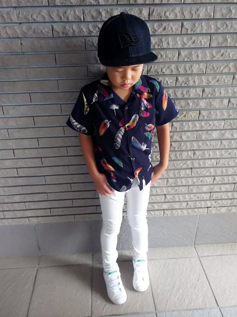 本日台風⚡️🌀☔️の中、習い事へ。 白のパンツは息子が履きやすく気に入ってて、ヘビロテ中💕 トップスのフェザーアロハシャツは、生地も薄く、色合いが可愛くて一目惚れして購入😵💘 デニムキャップと合わせて、いつものカジュアルコーデ完成✨