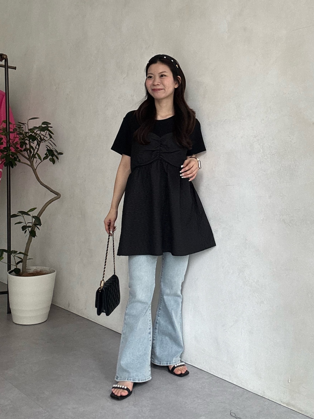 まりん(prose verse)のデニムパンツ「【美脚見え】ロゴパッチ付きストレッチフレアデニム」を使ったコーディネート