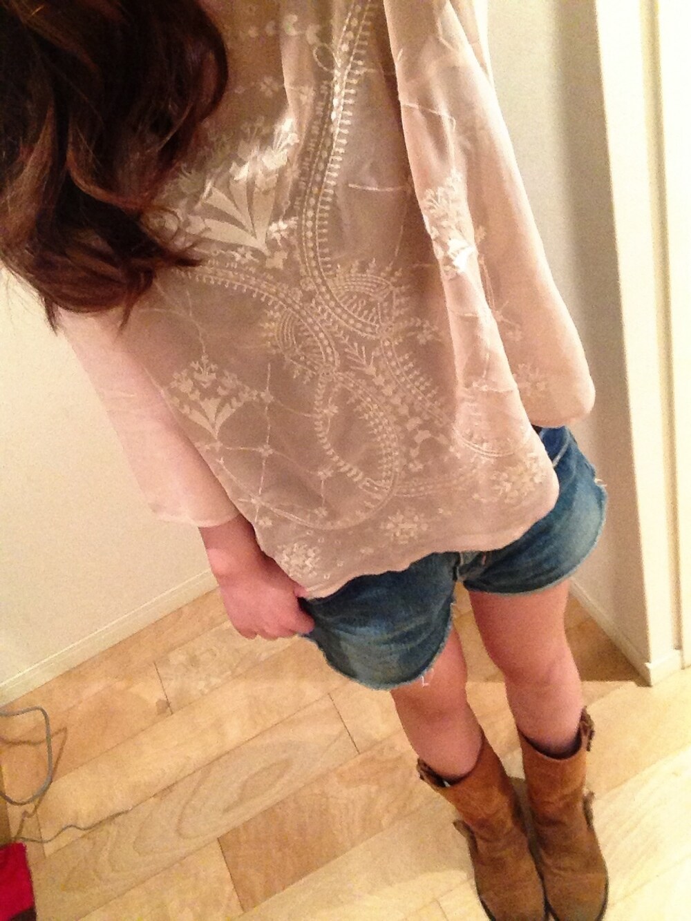 トップス:Forever21 この時期は肌の見せ加減が難しい… トップスの淡いピンクと刺繍がお気に入り♪♪