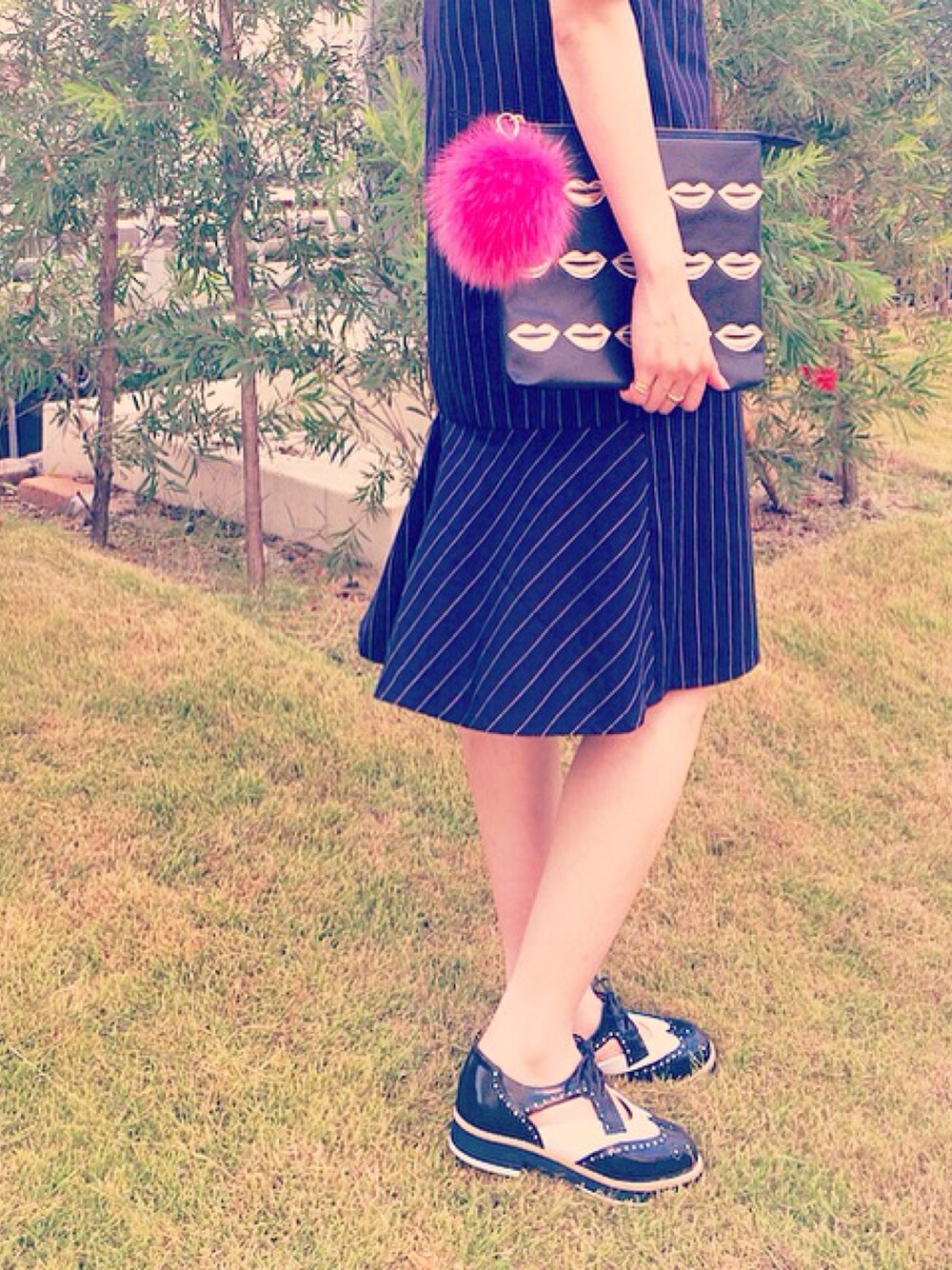 ふわふわのファーでできたポンポンは幸せな触り心地、、♥︎ 鮮やかなカラーがコーディネートのアクセントになります。 THE SURREY ファー チャーム ¥3,900+tax バックペプラムワンピース ¥28,000+tax HOUSE OF CASES リップ クラッチ ¥16,000+tax