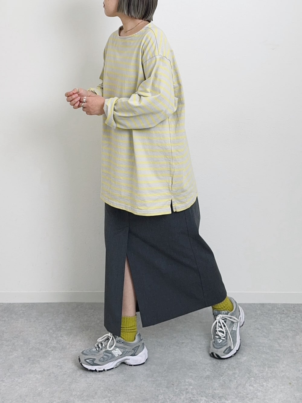 イエロー×グレーの春コーデ。 ボーダーのカラーとソックスの色を 合わせると コーデに統一感が出るのでおすすめ♡ 詳細はインスタで👨🏻🍳💭❕ ご質問・ご依頼等はInstagramまでお問い合わせください! Instagram: marin_vvv 🔍