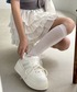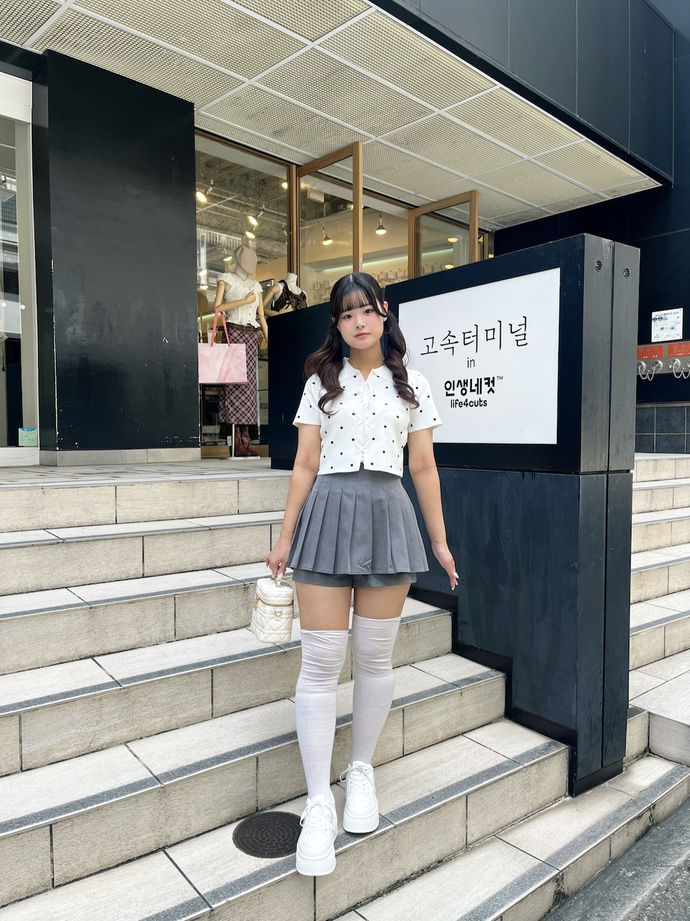 ♡トップス♡ 今流行りのドット柄のトップス💞 短めの丈感なので脚長効果ありで着ていただけます! ♡スカート♡ スカパンの形で、プリーツの部分が短くなっているので脚長効果ありで履いていただけます☺️ ♡スニーカー♡ 厚底になっているので-3kgになったみたいに細見えできちゃいます💞 ♡バッグ♡ この形の他のものに比べて大きめに作られているのでスマホや財布などすっぽり入る大きさになってます🍀*゜