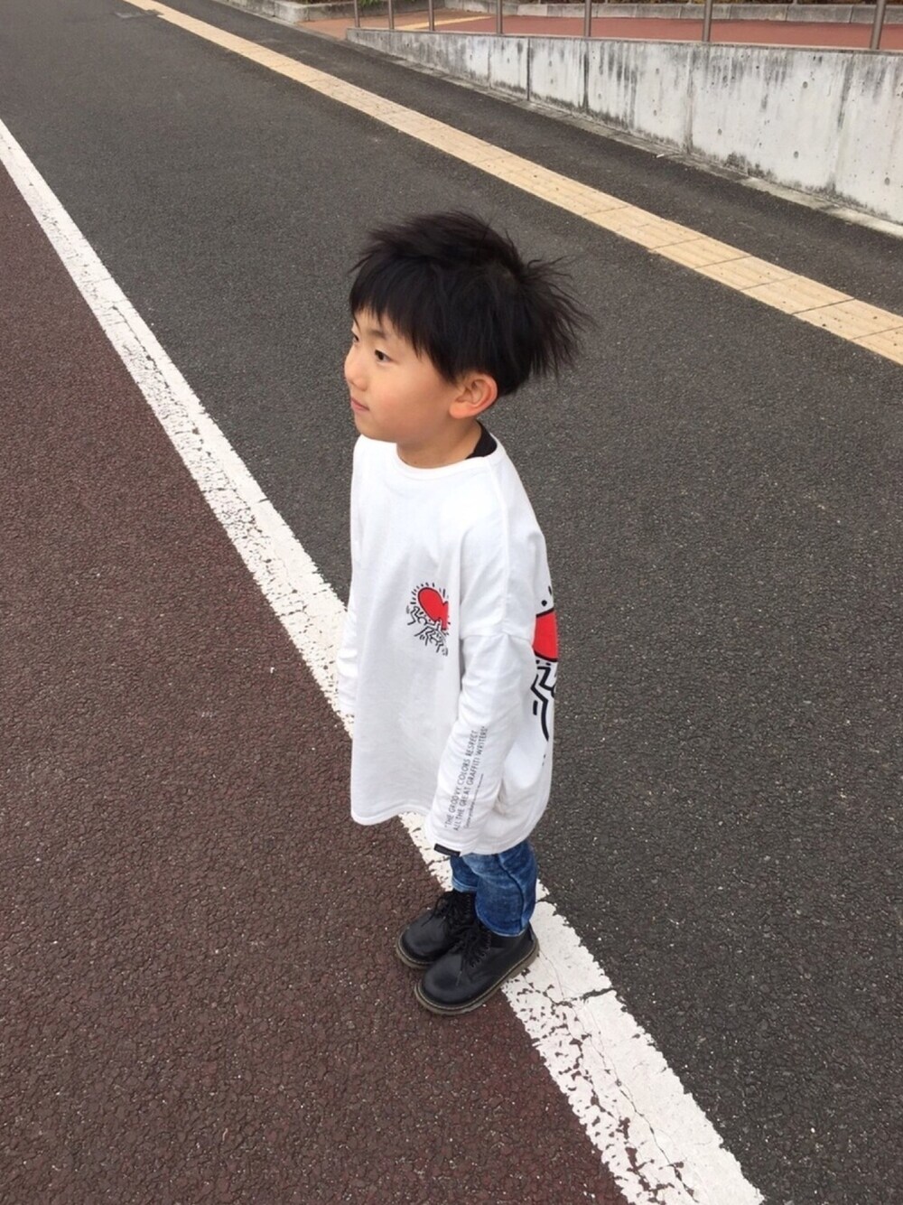 寝癖っぽいw キースヘリングTは大阪でジャケットと一緒に買いました。きゃわた〜ん 可愛いんだけどうまく伝わらないアングルby夫撮影 でも採用。 私は何度も何度も撮っても下手過ぎてボツ。被写体の問題か←おい親!