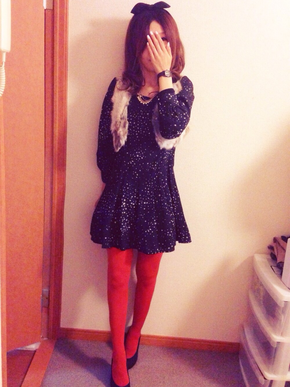 ファーベスト:W closet タイツ:3coins ハロウィンパーティがあるのでオレンジのタイツと星柄ワンピースであわせてみました🎃 暖色系タイツは足の極太さが強調されるから 今日くらいしか活躍しないとゆー…(o◞ิ‿◟ิo)