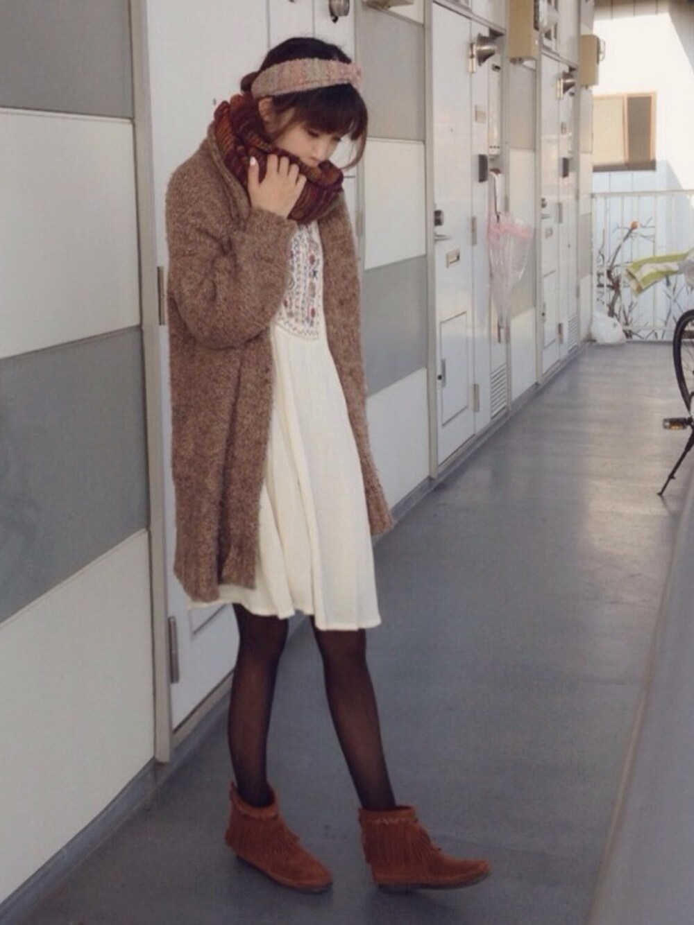 マフラー:むげん堂 ヘアバンド:3Coins ワンピース:w closet なんだかモコモコ丸くなってしまった…꒰(๑´•.̫ • `๑)꒱