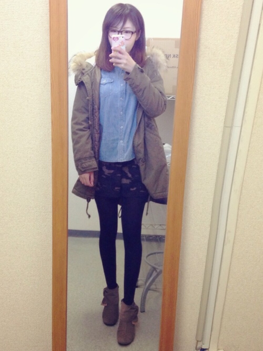 デニムシャツ:無印良品 カモフラパンツ:zootie ダテメガネ:merの付録 ブーティ久々に履いたっ!
