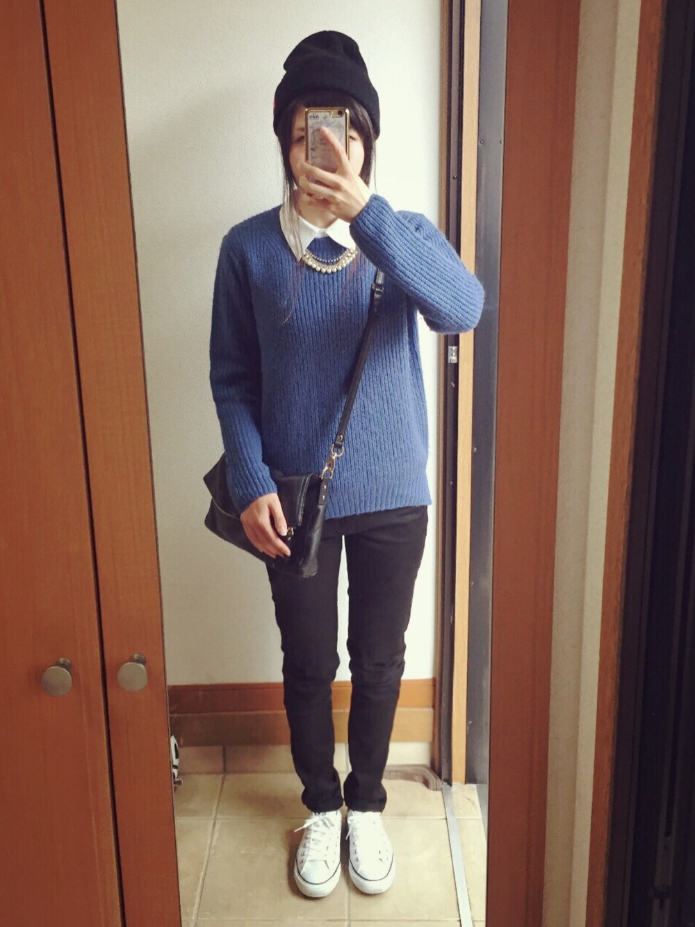 実家に帰ってから下着以外の着替えを全て忘れてきた事に気づき、お母ちゃんの服を借りました。 シャツ、ニット、スキニー、スニーカー 小物以外は全て母の物です(o◞ิ‿◟ิo) 違和感なさすぎて笑いましたw