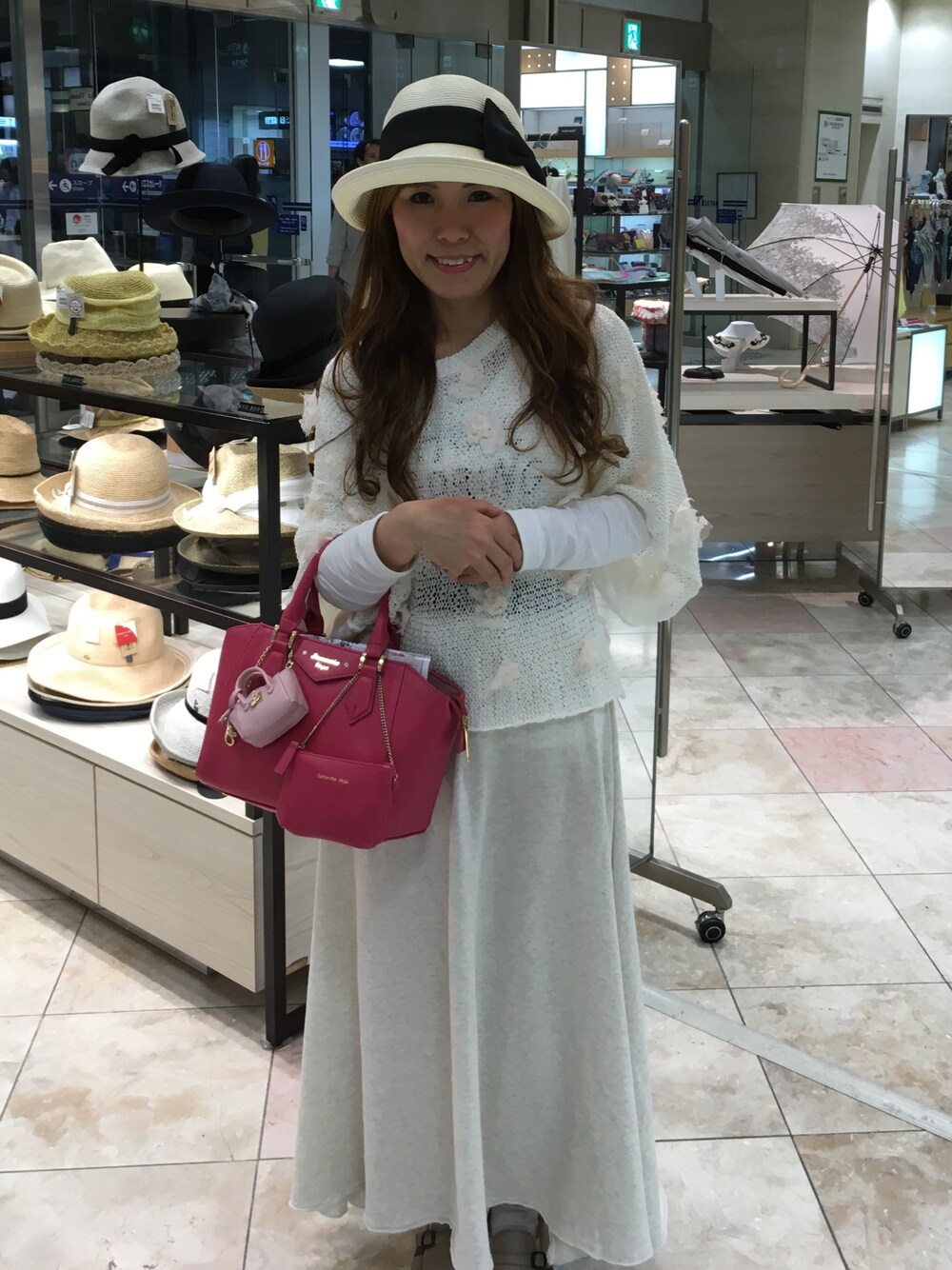 ホワイト系のTシャツ/カットソー、ベージュ系のハットを着用したレディースの春コーディネートの1枚目の写真