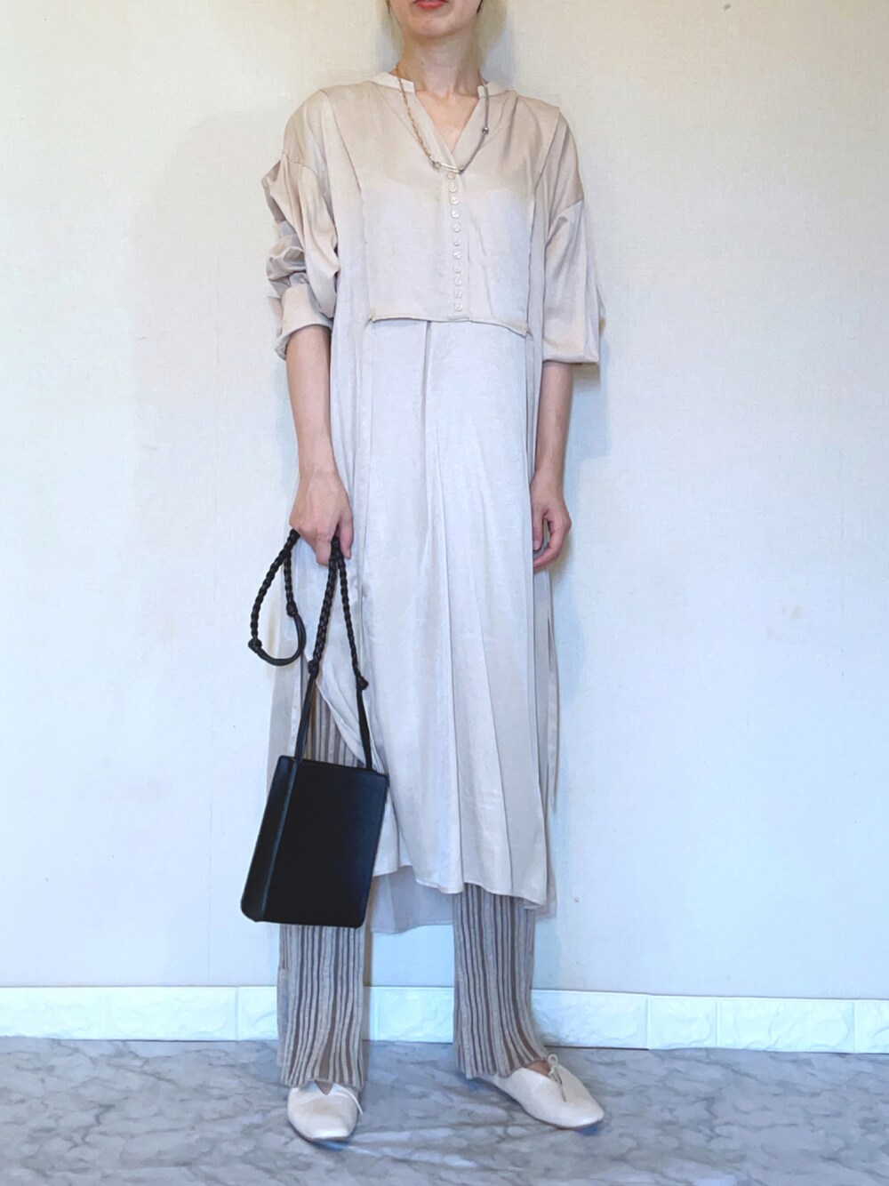 MARINのシャツワンピース「CORNERS by KR ヴィンテージサテンカフタンシャツワンピース」を使ったコーディネート