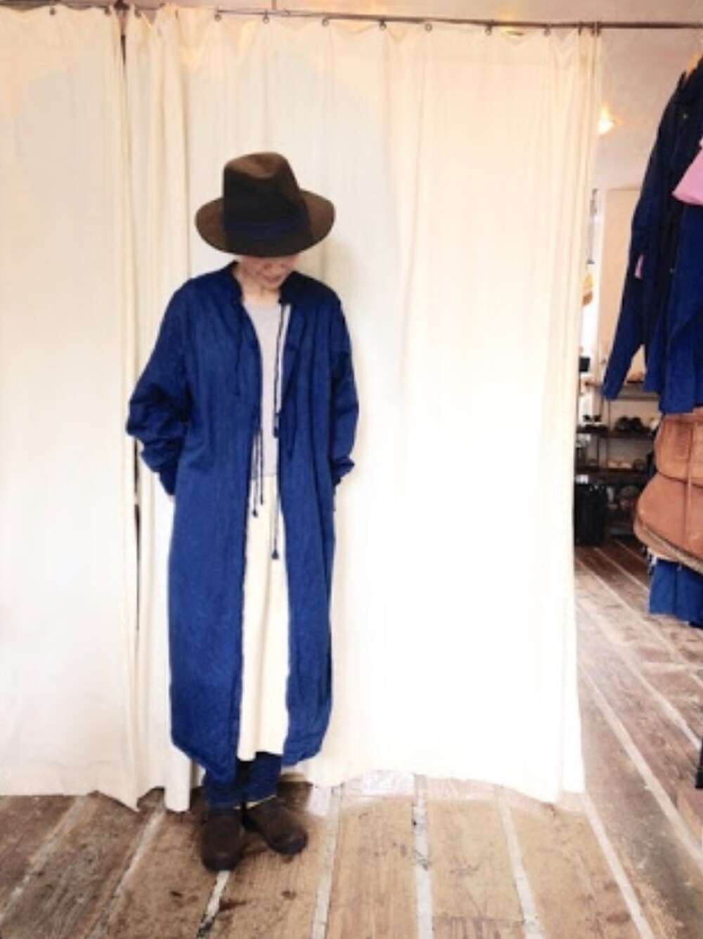 アメリカ軍のドクターコートのデッドストックを藍染にしたものです。前でも後ろでも着れます。 反対に着るとワンピースみたいで可愛いです。