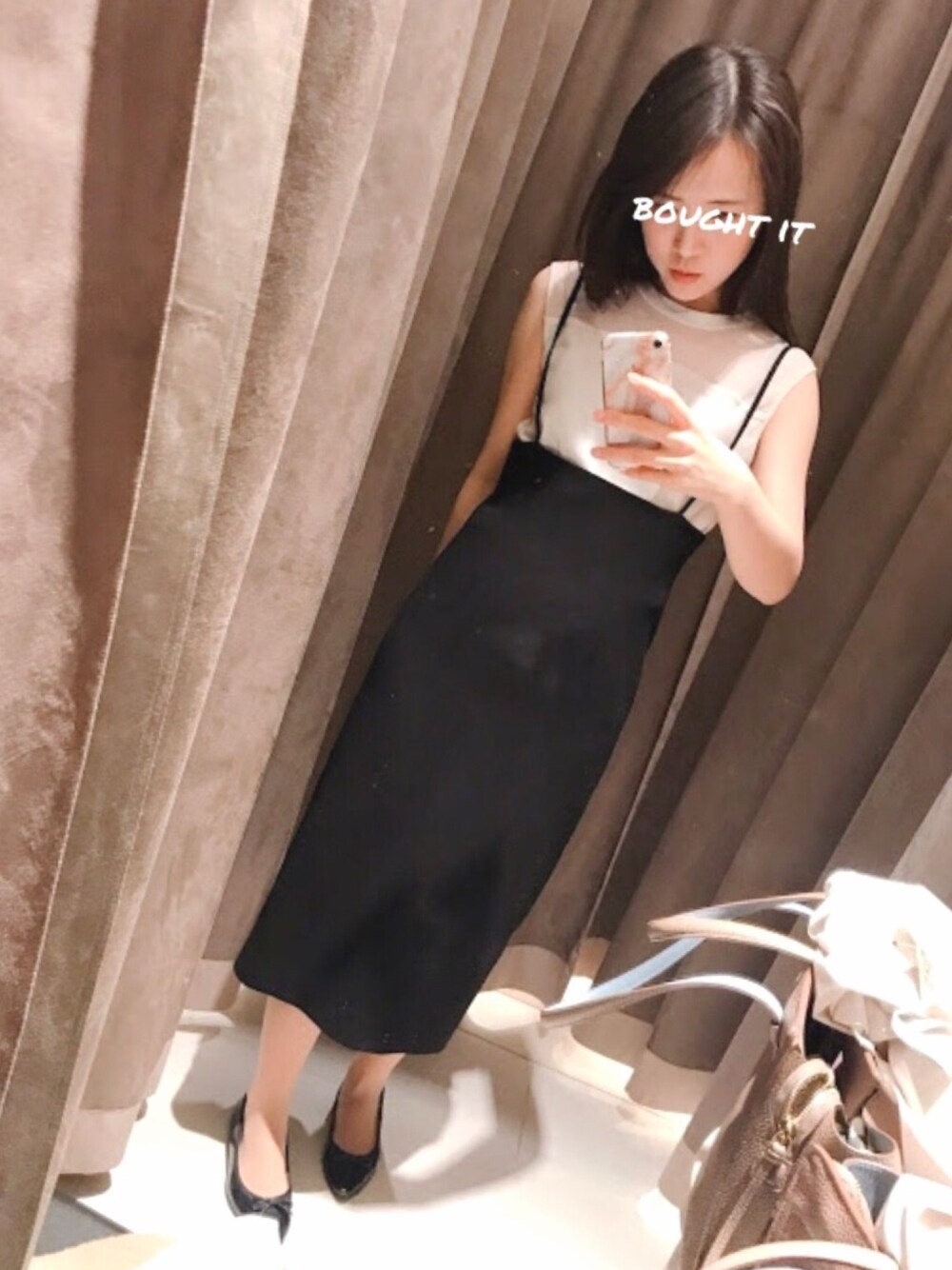 このトップスもかったもの。ノースリーブが勇気が出なくて一枚で着られないから、白かベージュのカーディガンを肩かけしよう。デコルテ周辺は、シースルーですけてるけど、範囲が狭いのでオフィスにもー。