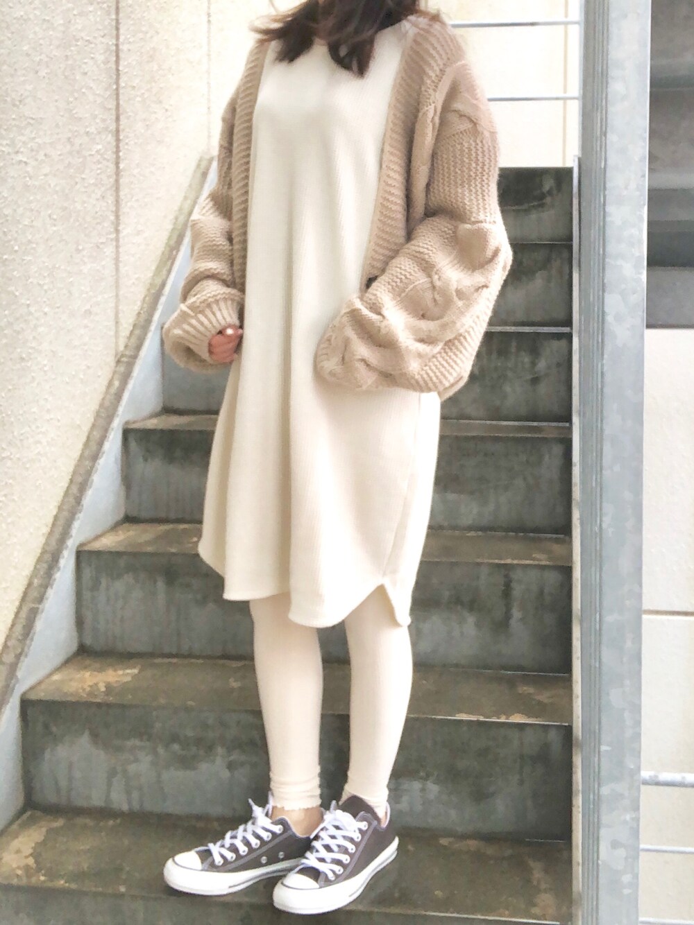 スニーカーがチョコ色🍫 大好きワッフル素材のチュニック買ってみました。まずはレギンス合わせ。ひらひらスカートと合わせたりもできるかな...?とコーデ思案中です。