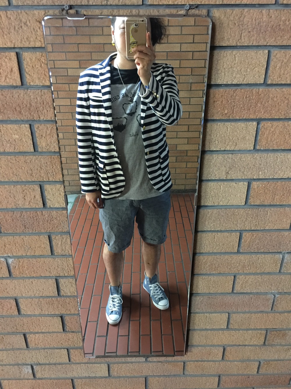 ネタが無くなってきたので着まわしコーデです。 海に来ていかないだろ?って感じのボーダージャケットでプチマリンルックです。