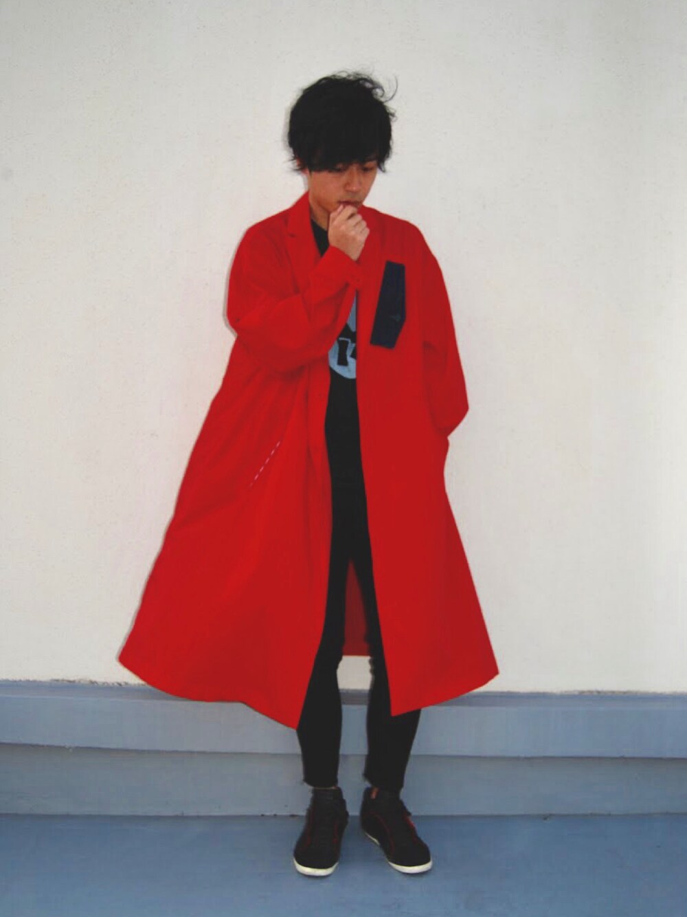 真っ赤でガサガサな素材のカジュアルなコートなので他はシンプルにまとめています。スニーカーとバンドtシャツで赤をリレーションしてます。