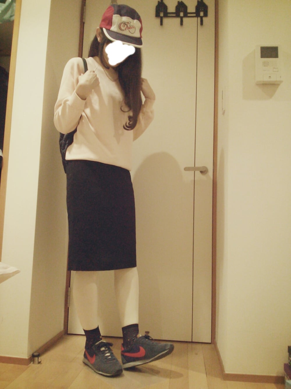 キャップは配色と形と自転車の柄がお気に入りです! ちょいとスポーティにしてみました(^^) ピンクのスウェットとスカートは古着です。