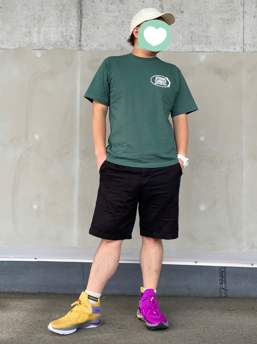 みなさんこんにちは、こんばんは!🐈 いつもご覧いただきありがとうございます! 今回はシンプルにカラーTと黒のハーフパンツに足元をマルチカラーのスニーカーで合わせました!