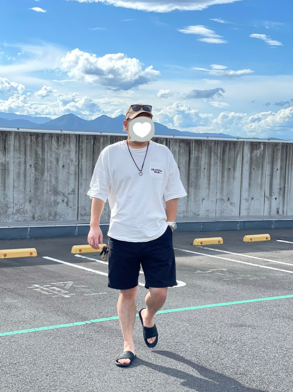 みなさん、こんにちは、こんばんは!🐈 いつもご覧いただきありがとうございます! 今回はシンプルに合わせました! グレイトフル・デッドの白Tに 黒のハーフパンツとUGGのサンダル! ジョーダンのベージュキャップで遊びを入れつつGUCCIの黒のサングラスとクロムハーツでゆったりもしつつ締まった感じもありつつというコーデです!